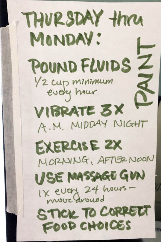 I have an uninterrupted period of five days in which I have no appointments and therefore no real need to leave the house, so I have written myself a list of all these intentions, and my plan is to implement them without fail every day of those five, to see what occurs with the concentrated use of food, fluid, exercise, and massage. Ideally, by next Tuesday morning (when I have a breakfast date with a friend), my legs will have improved significantly by putting all of this into practice.