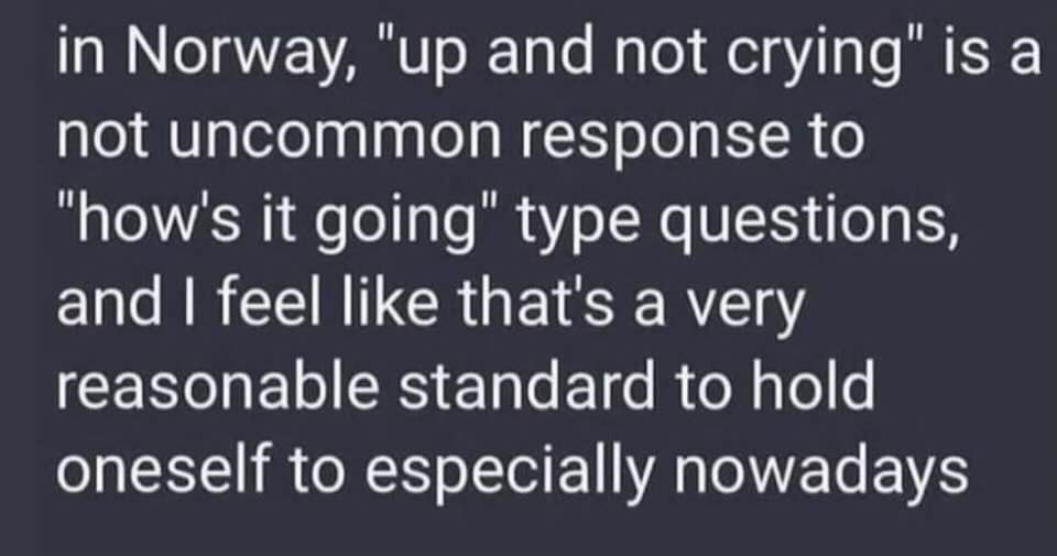 I came across this meme recently on Facebook and immediately saved it for myself. Although I am not Norwegian, I completely agree with their sometimes low standard for daily check-ins: