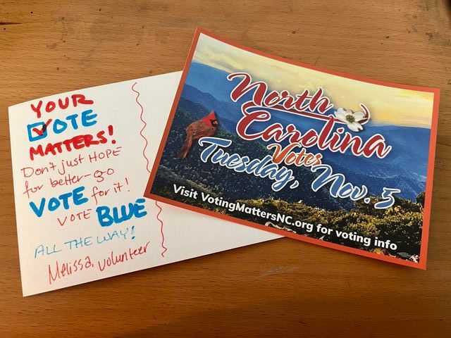 Meanwhile, in other interactions with the postal service, I ordered postcard stamps so I could mail the last batch of cards I have written begging residents of North Carolina to “VOTE BLUE,” and I’m beginning to worry that they are not going to receive said cards before the election on November 5th if I’m relying on the post office to both bring the stamps and deliver the postcards!