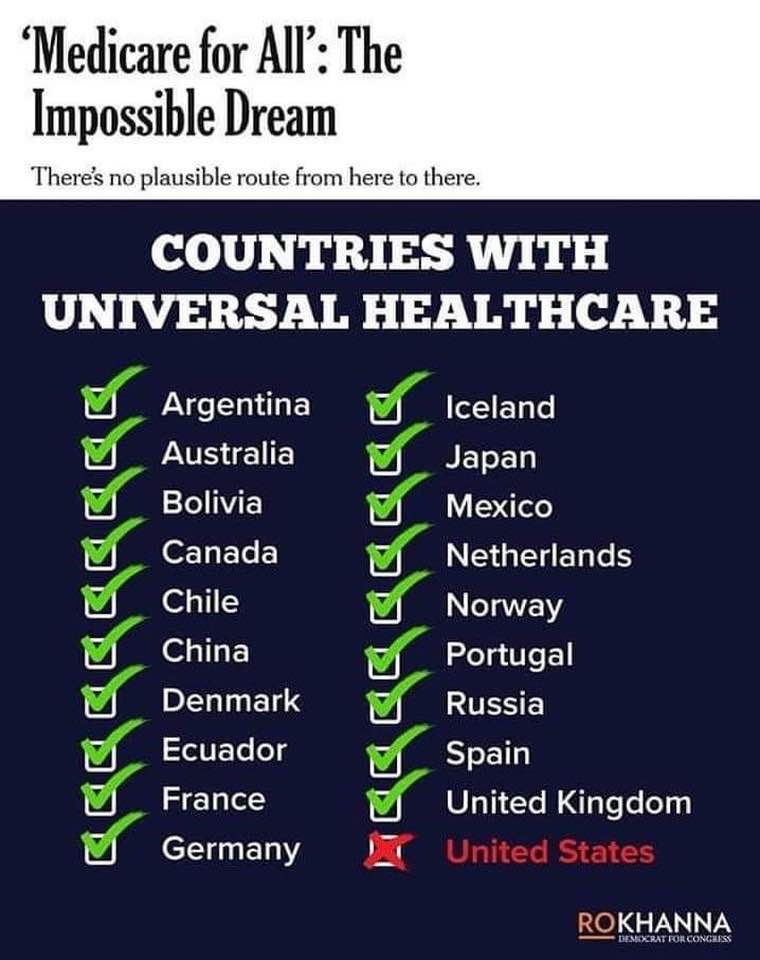 Have you ever seen that meme that says something like “what country has ever been able to make universal healthcare work?” and then it lists every single democratic country except ours? (plus a few others—see below) Well, this post is to say, I’m wishing about now that I lived in any one of them, while realizing that it’s probable none of them would want me, as a retired person with no work years left to share and with the sole intent of loving them for their benefits.